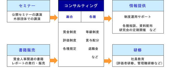 賃金総合コンサルティングを中心に、賃金・人事制度におけるお客様の課題解決に向けた様々なサービスを提供しております。
